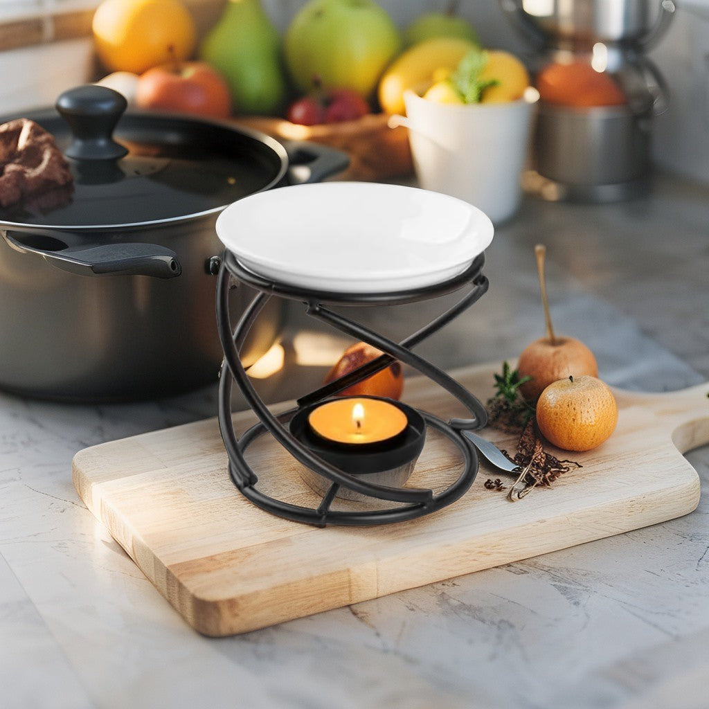 Laissez-vous séduire par ce brûleur en céramique et fer noire au design moderne. Parfait pour fondre vos fondants parfumés ou huiles essentielles, il diffuse une douce chaleur et une ambiance romantique. Un objet déco raffiné qui allie utilité et élégance.