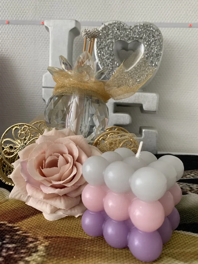 Cette création est fait main et chaque détail de cette bougie évoque la beauté et la fragilité d’une fleur fraîchement éclose ou d'une superposition de mini boules, symbolisant l’amour, la tendresse et le souvenir éternel.